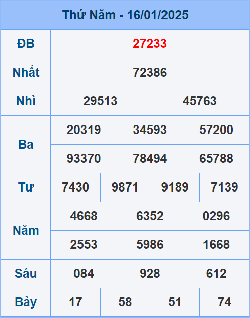⇒ Giải Đặc Biệt ngày 16/01: 27233