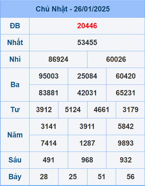 ⇒ Giải Đặc Biệt ngày 26/01: 20446