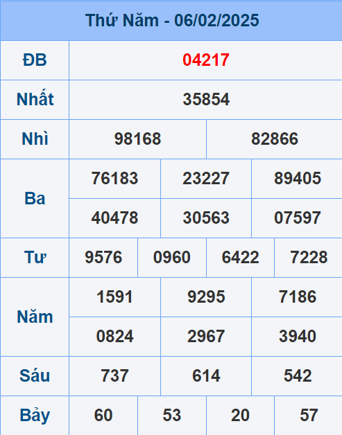 ⇒ Giải Đặc Biệt ngày 06/02: 04217
